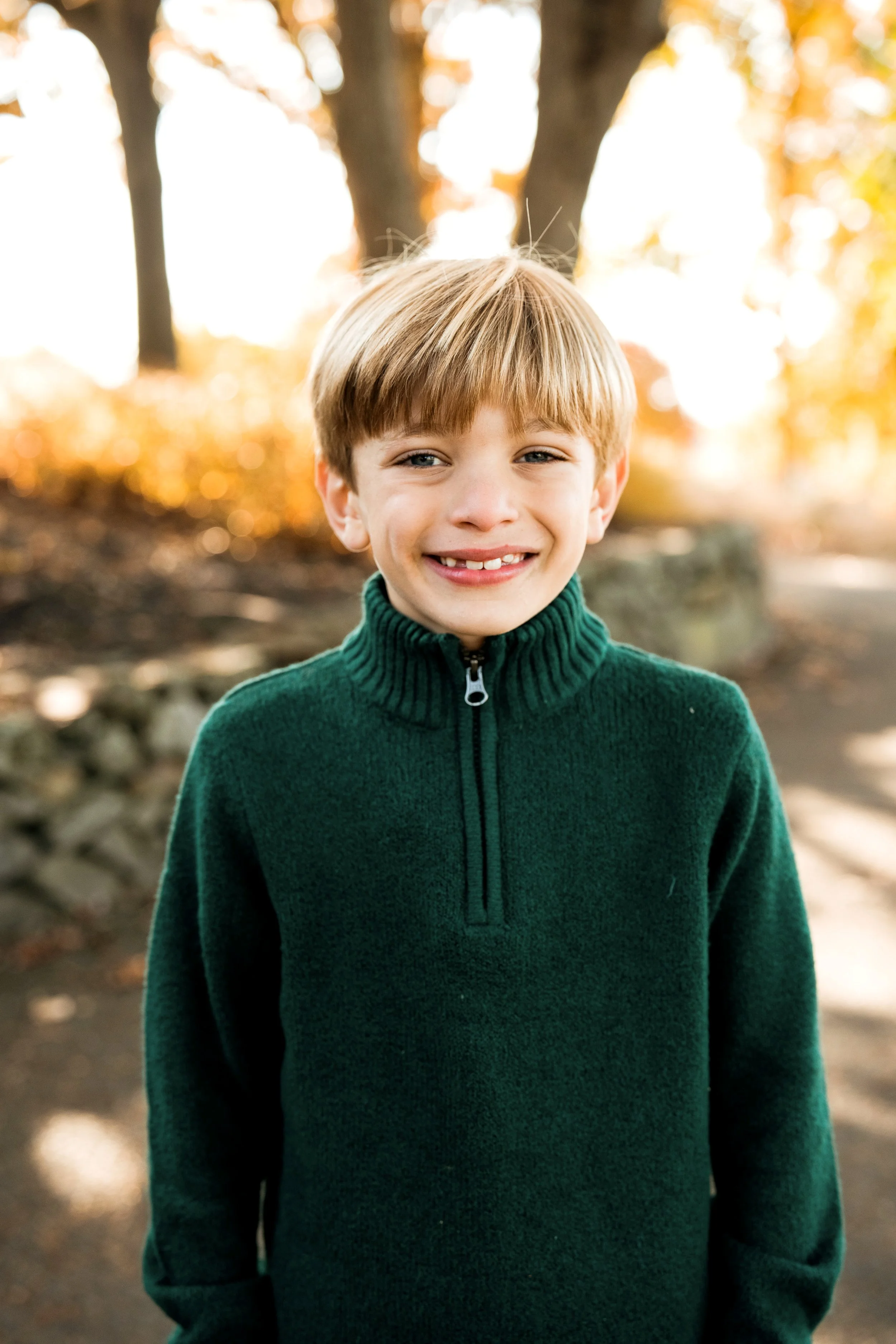 A smiling young boy with blond hair wearing a green zip-up sweater, standing outdoors during autumn with trees and fallen leaves in the background.